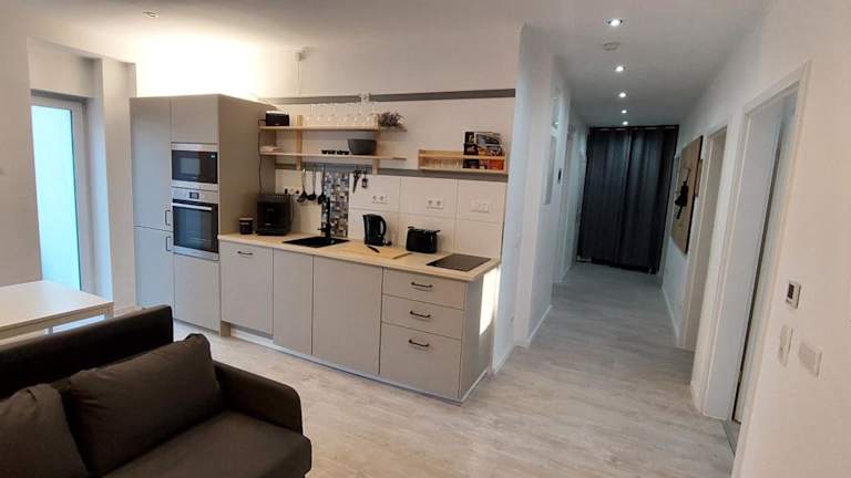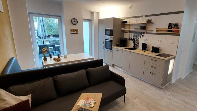 Die Ferienwohnung verfügt über 3 Schlafzimmer, ein Badezimmer, einen Essbereich, eine voll ausgestattete Küche und einen Balkon mit Gartenblick. Zur Ausstattung gehören Bettwäsche, Handtücher, ein Flachbild-TV mit Satellitenkanälen sowie WLAN in allen Bereichen.