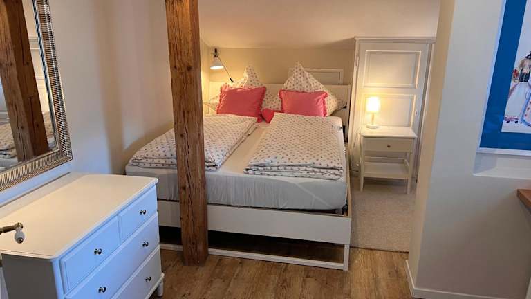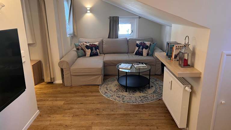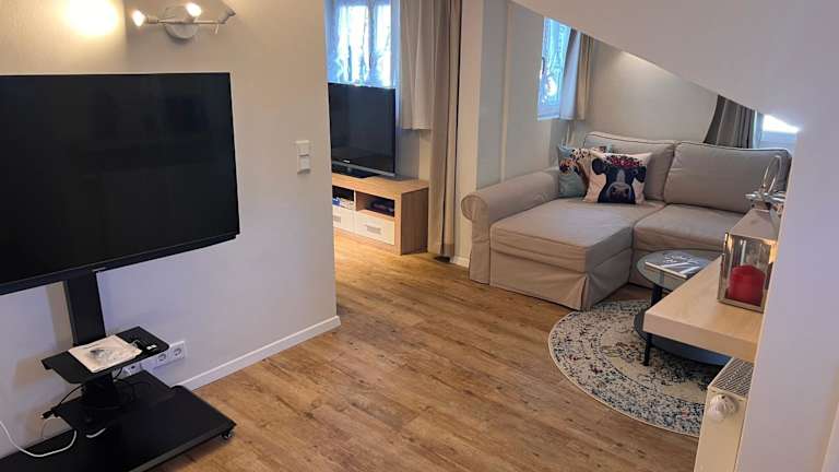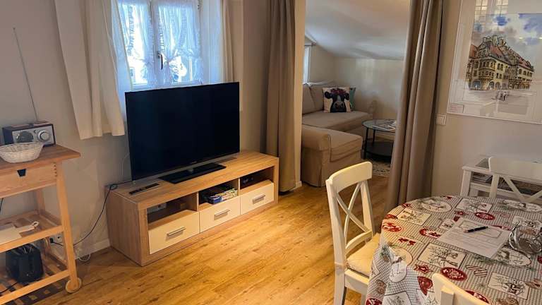 Die Ferienwohnung verfügt über eine voll ausgestattete Küche mit Kühlschrank, Geschirrspüler und Ofen. Zur Einrichtung gehören ein Wohnzimmer mit Sitz- und Essbereich, zwei Schlafzimmer sowie ein Badezimmer mit Bidet und Dusche. Handtücher und Bettwäsche werden bereitgestellt.
