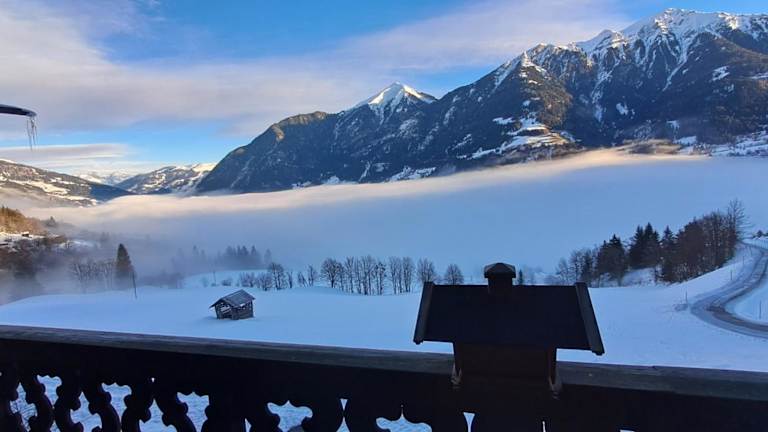 Die Ferienwohnung bietet einen Balkon mit Bergblick und eine vollständig ausgestattete Küchenzeile.