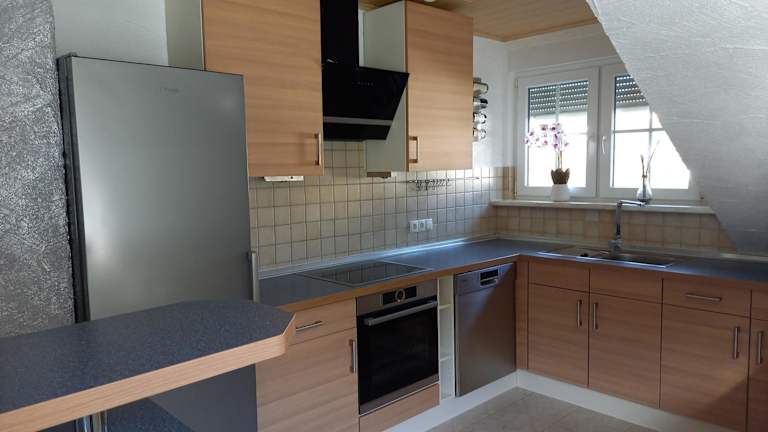 Die Ferienwohnung verfügt über eine gut ausgestattete Küche, die mit einem Kühlschrank, Geschirrspüler, Ofen, Kaffeemaschine und Wasserkocher ausgestattet ist.