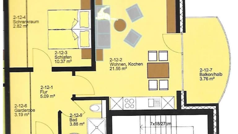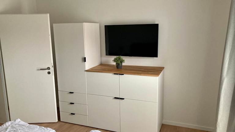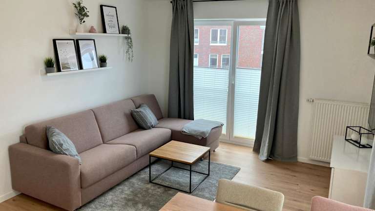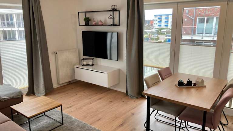 Die Ferienwohnung ist mit einem Schlafzimmer, einer Küche ausgestattet mit Kühlschrank und Geschirrspüler, einem Flachbild-TV und einem Sitzbereich eingerichtet. Des Weiteren gibt es ein Badezimmer mit Dusche. Handtücher und Bettwäsche können gegen Aufpreis bereitgestellt werden.
