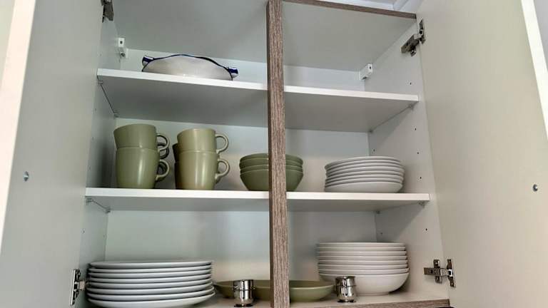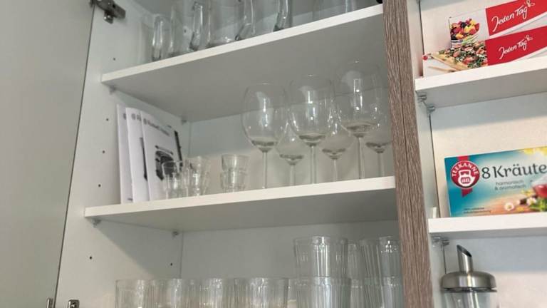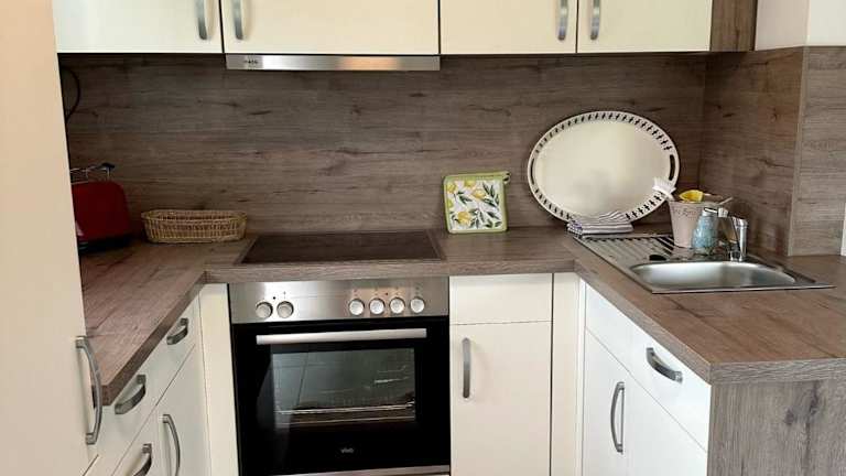 Die Küchenzeile der Ferienwohnung ist mit einem Kühlschrank, einem Geschirrspüler, einem Ofen, einer Kaffeemaschine und einem Wasserkocher ausgestattet, was die Selbstverpflegung ermöglicht.
