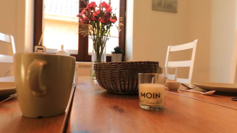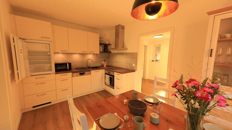 Die Ferienwohnung verfügt über eine voll ausgestattete Küche, die mit einem Kühlschrank und einer Kaffeemaschine ausgestattet ist. Es sind keine Informationen zu weiteren Verpflegungsmöglichkeiten vorhanden.