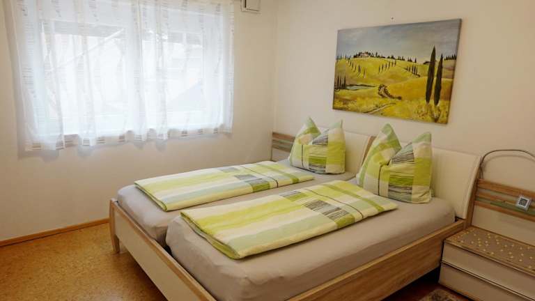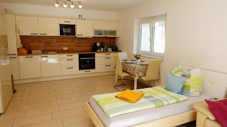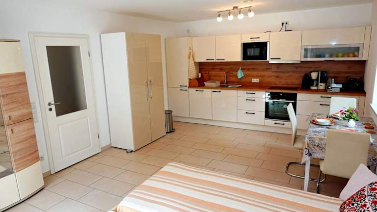 Die Ferienwohnung verfügt über ein Schlafzimmer, eine Küchenzeile mit Kühlschrank und Mikrowelle sowie ein Badezimmer mit Dusche, Haartrockner und Waschmaschine. Handtücher und Bettwäsche werden zur Verfügung gestellt.