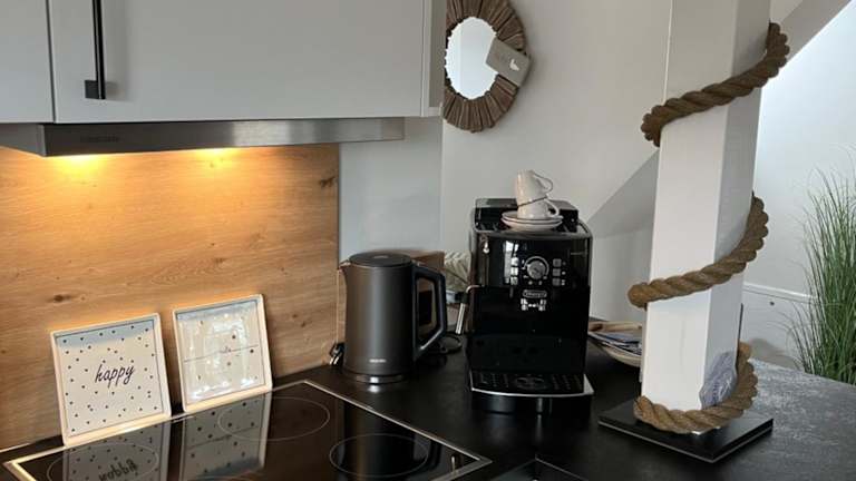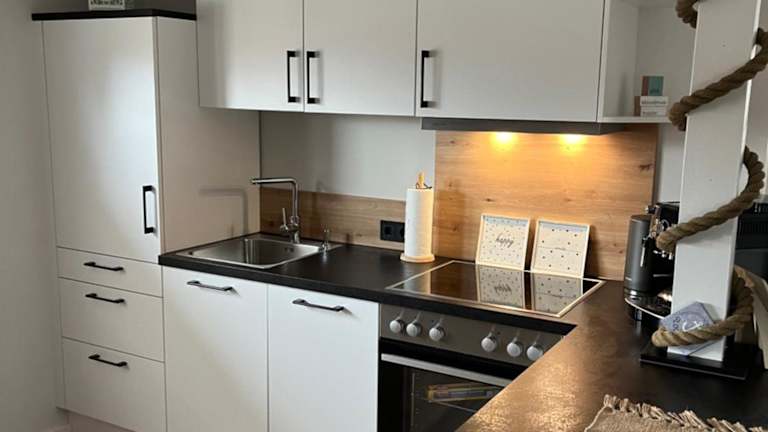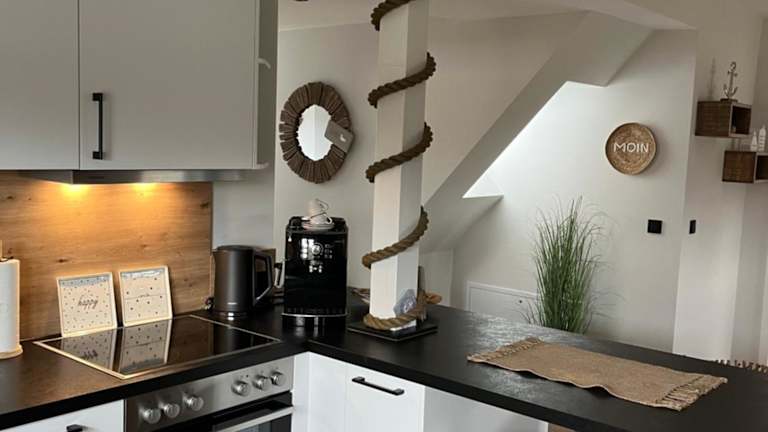 Die Ferienwohnung verfügt über eine voll ausgestattete Küche, die mit einem Kühlschrank und einem Geschirrspüler ausgestattet ist. Es sind keine speziellen Verpflegungsmöglichkeiten oder Gastronomieangebote angegeben.