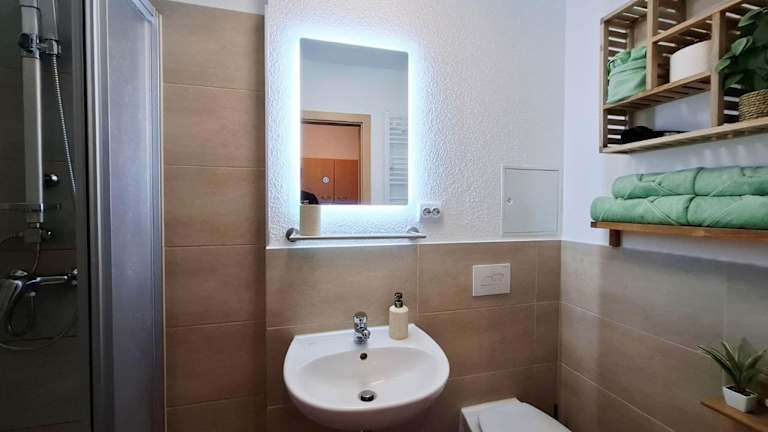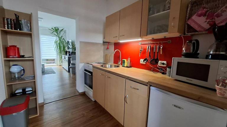 Die Ferienwohnung verfügt über ein Schlafzimmer, ein Wohnzimmer, eine gut ausgestattete Küche sowie ein Badezimmer mit Dusche. Die Ausstattung umfasst einen TV und eine Terrasse, die einen Blick auf den Garten bietet.