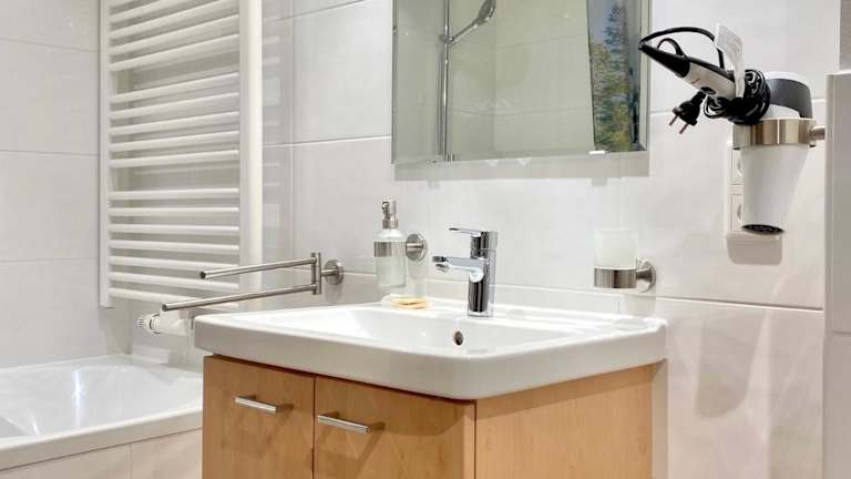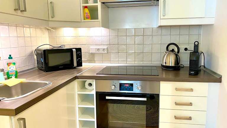 Die Ferienwohnung umfasst 1 Schlafzimmer, eine Küche mit Kühlschrank und Ofen sowie 2 Badezimmer, die mit Dusche und Haartrockner ausgestattet sind. Handtücher und Bettwäsche stehen zur Verfügung.