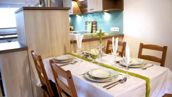 Die Ferienwohnung umfasst ein Schlafzimmer, ein Wohnzimmer und eine voll ausgestattete Küche mit Kühlschrank und Kaffeemaschine. Ein Badezimmer mit Dusche und Haartrockner ist ebenfalls vorhanden. Handtücher und Bettwäsche werden bereitgestellt.