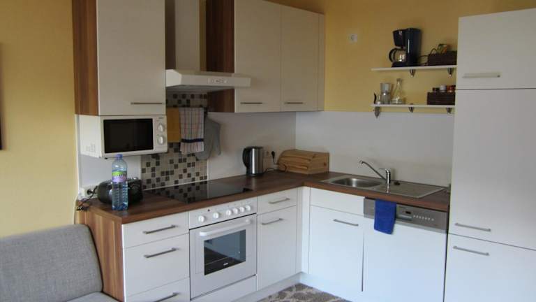 Die Ferienwohnung umfasst zwei Schlafzimmer sowie ein Wohnzimmer und verfügt über einen Balkon mit Blick auf die Berge. Eine gut ausgestattete Küche mit Kühlschrank und Geschirrspüler ist vorhanden. Das Badezimmer ist mit einer Dusche ausgestattet. Handtücher und Bettwäsche werden gestellt.