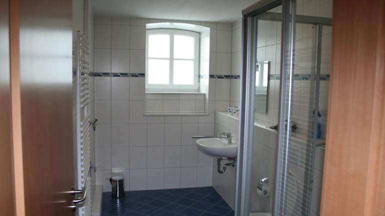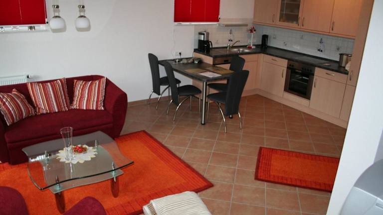 Die Ferienwohnung umfasst eine Küche, die mit einem Kühlschrank und einem Geschirrspüler ausgestattet ist, um die Selbstversorgung der Gäste zu ermöglichen.