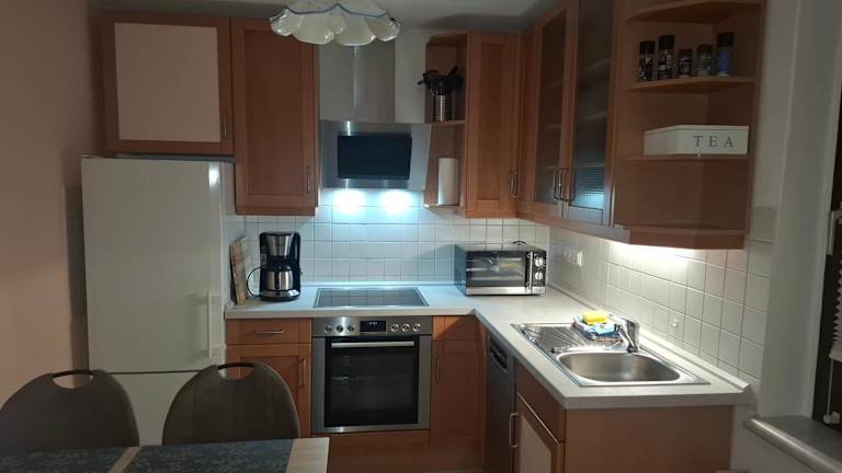 Die Unterkunft bietet zwei Schlafzimmer, ein Wohnzimmer, einen Flachbild-TV sowie eine gut ausgestattete Küche mit Kühlschrank und Ofen. Es gibt ein Badezimmer mit Dusche und es werden Handtücher sowie Bettwäsche bereitgestellt.