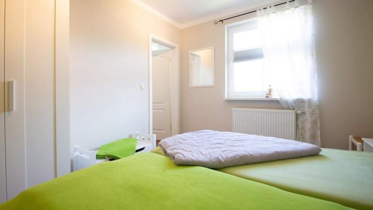 Die Ferienwohnung beinhaltet ein Schlafzimmer, eine Küche mit Kühlschrank und Geschirrspüler sowie ein Badezimmer mit Dusche und Haartrockner. Die Ausstattung umfasst auch Heizung, WLAN und Gartenmöbel.