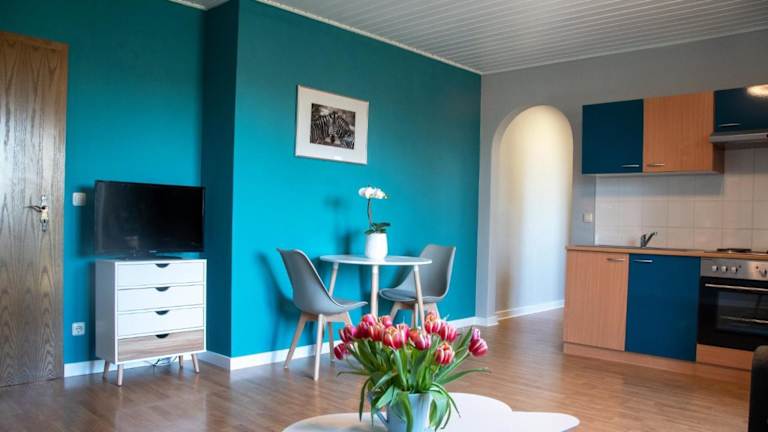Die Ferienwohnung verfügt über ein Schlafzimmer, ein Wohnzimmer und eine gut ausgestattete Küche. Das Badezimmer ist mit einer Dusche sowie einer Badewanne ausgestattet. Zur weiteren Ausstattung gehören ein Satelliten-TV sowie eine Kaffeemaschine, und die Unterkunft bietet zudem eine Veranda oder ein Patio.