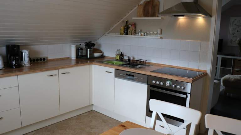 Die Ferienwohnung beinhaltet eine gut ausgestattete Küche mit Kühlschrank, Geschirrspüler und Ofen, um eigene Mahlzeiten zubereiten zu können.