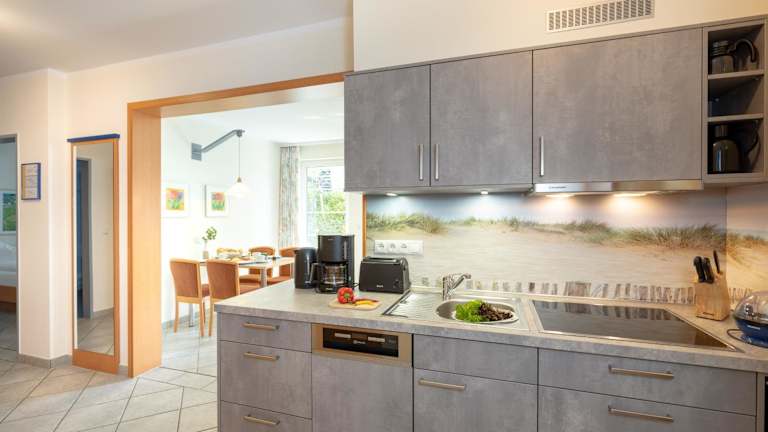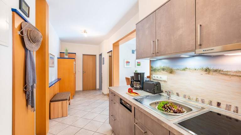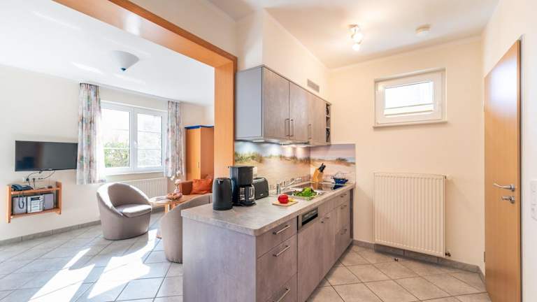 Die Wohnung umfasst ein Schlafzimmer, ein Wohnzimmer und eine voll ausgestattete Küche mit Kühlschrank und Kaffeemaschine. Das Badezimmer ist mit einer Dusche und einem Haartrockner ausgestattet. Handtücher und Bettwäsche werden bereitgestellt.