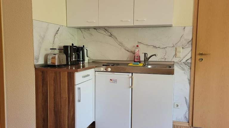 Die Ferienwohnung verfügt über eine voll ausgestattete Küchenzeile mit Kühlschrank, Ofen, Mikrowelle, Herdplatte, Toaster, Kaffeemaschine und Wasserkocher, sodass die Zubereitung von Mahlzeiten möglich ist.