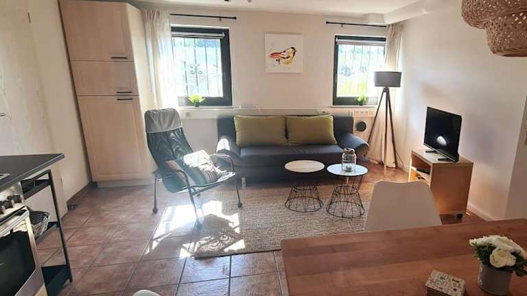 Die Ferienwohnung umfasst ein Schlafzimmer, ein Wohnzimmer und ein eigenes Badezimmer mit Dusche. Zur Ausstattung gehört ein Flachbild-TV sowie eine gut ausgestattete Küche mit Kühlschrank und Geschirrspüler. Handtücher und Bettwäsche werden bereitgestellt.