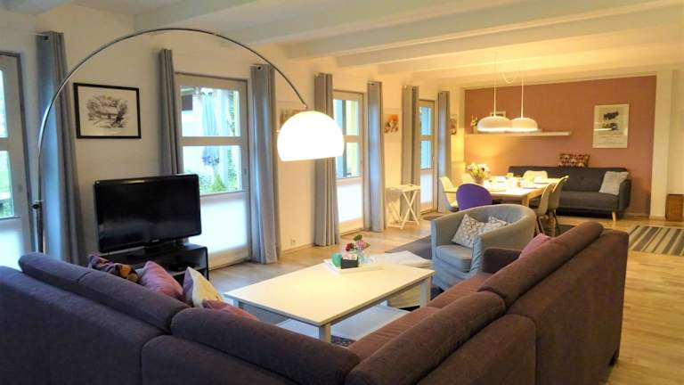Die Ferienwohnung umfasst ein Wohnzimmer, einen Essbereich, eine Küche mit Kühlschrank, Geschirrspüler und Ofen sowie zwei Schlafzimmer. Es gibt ein Badezimmer mit einer Dusche und allergikerfreundliche Zimmer sind verfügbar. Ein Blu-ray-Player und Gartenmöbel sind ebenfalls vorhanden.