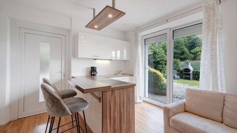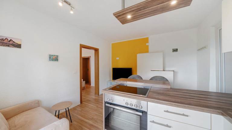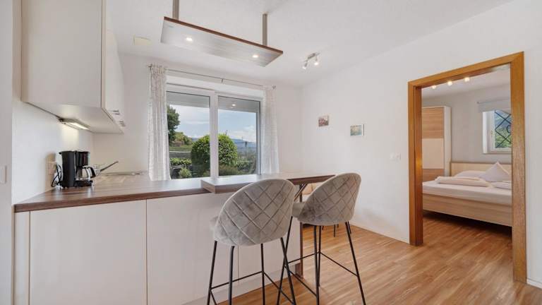 Die Ferienwohnung verfügt über 1 Schlafzimmer, 1 Badezimmer, Bettwäsche, Handtücher, einen TV, eine voll ausgestattete Küche und eine Terrasse mit Bergblick.