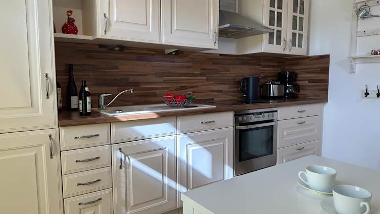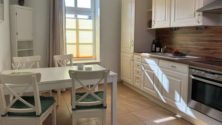 Die Ferienwohnung verfügt über eine Küche, die mit einem Kühlschrank und einem Ofen ausgestattet ist, was eine selbstständige Verpflegung ermöglicht. Weitere Informationen zu Verpflegungsmöglichkeiten sind nicht vorhanden.