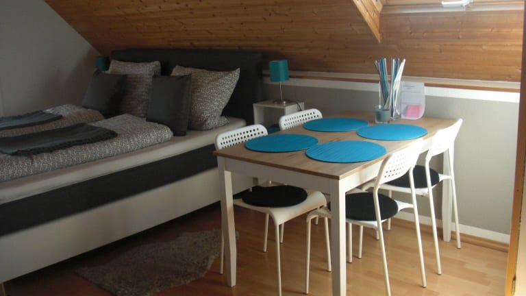 Die Ferienwohnung Misita ist im gemütlichen Landhausstil eingerichtet und bietet ein Schlafzimmer, das über eine Wendeltreppe erreicht wird. Hier finden Sie auch einen Flachbild-Sat-TV für Ihre Unterhaltung. Die Küche ist komplett ausgestattet mit einem Kochfeld und einer Senseo-Kaffeemaschine, so dass Sie sich problemlos Ihre eigenen Mahlzeiten zubereiten können. Ein Essbereich ist ebenfalls vorhanden, um Ihre Speisen zu genießen. Kostenloses WLAN steht Ihnen zur Verfügung, um mit Familie und Freunden in Kontakt zu bleiben.