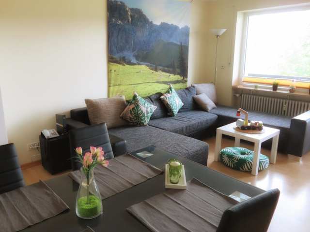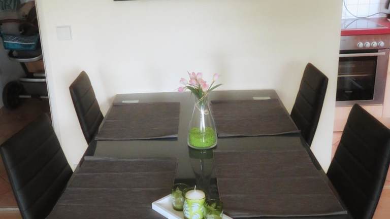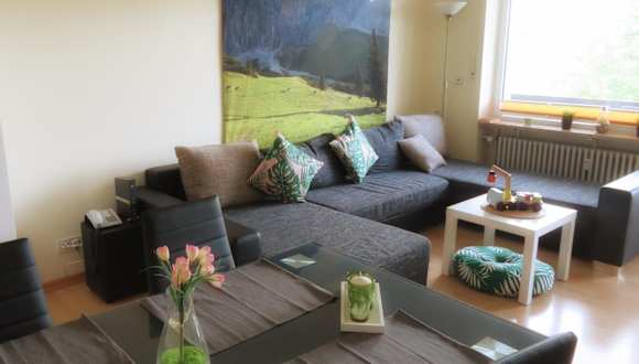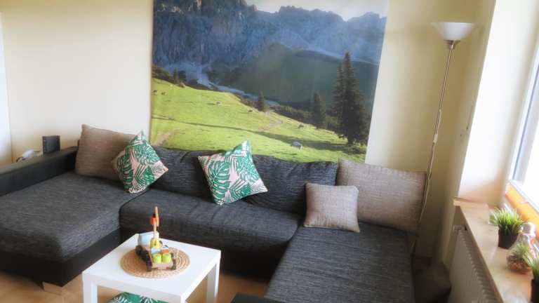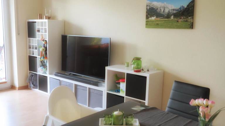 Die Ferienwohnung bietet Platz für bis zu zwei Personen und verfügt über ein Schlafzimmer, ein Wohnzimmer mit Flachbild-TV sowie eine gut ausgestattete Küche mit Kühlschrank und Ofen. Ein Badezimmer mit Badewanne ist ebenfalls vorhanden. Handtücher und Bettwäsche werden bereitgestellt. Ein Balkon mit Bergblick ergänzt das Angebot.