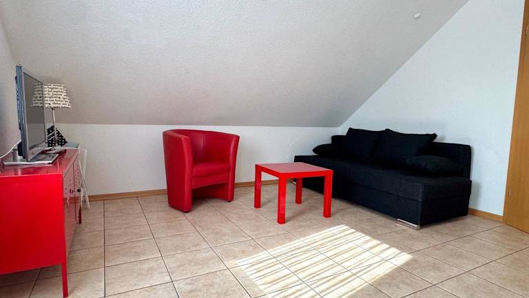 Die Ferienwohnung verfügt über ein Schlafzimmer, ein Badezimmer und ein Wohnzimmer, das mit einem Flachbild-TV ausgestattet ist.