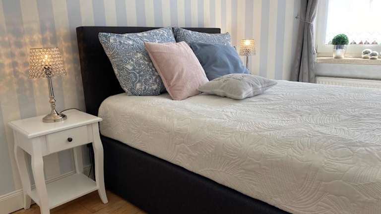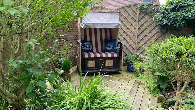 Die Ferienwohnung verfügt über 2 Schlafzimmer, ein Wohnzimmer mit Kabel Flachbild-TV, eine gut ausgestattete Küche sowie 1 Badezimmer, das mit einer Dusche und einer Badewanne ausgestattet ist. Handtücher und Bettwäsche werden bereitgestellt. Eine Terrasse ist ebenfalls vorhanden, die einen Blick auf den Garten bietet.