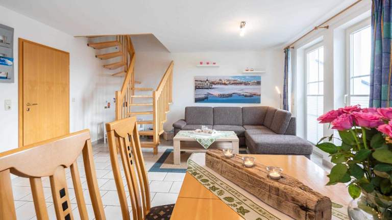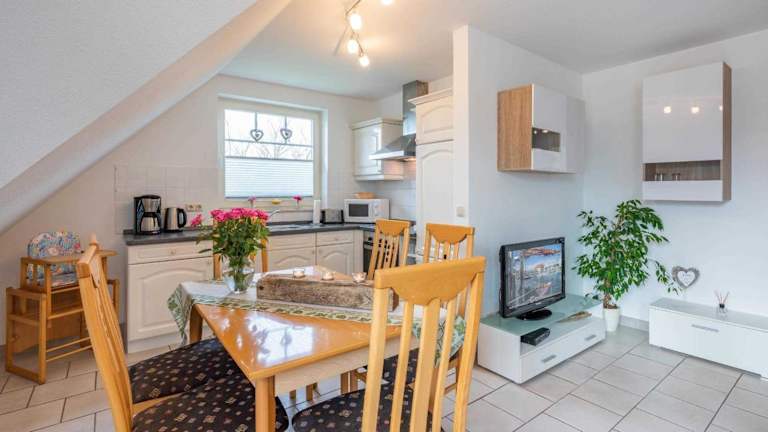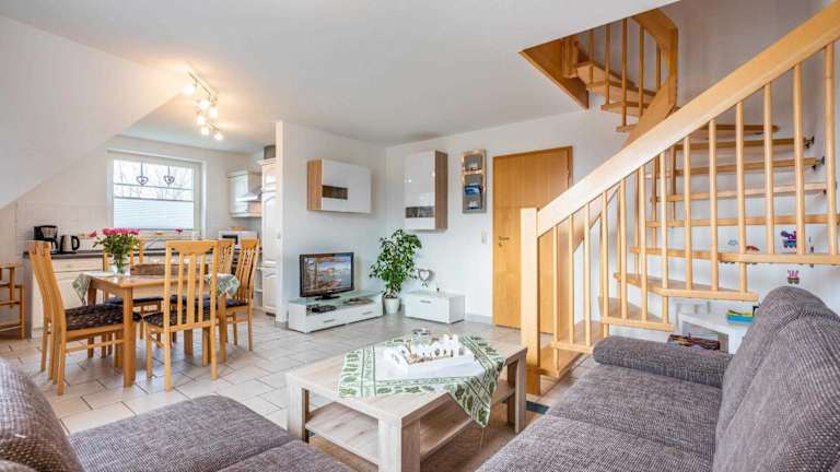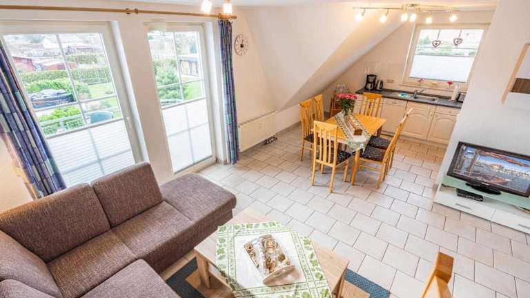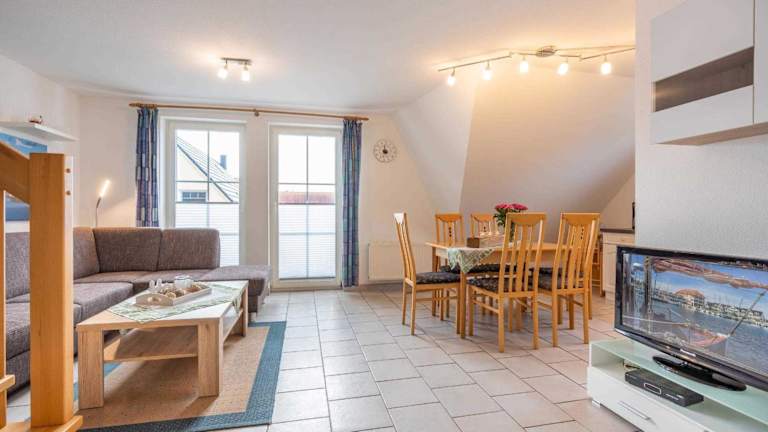 Die Ferienwohnung verfügt über zwei Schlafzimmer, einen Wohnbereich mit einem Flachbild-TV, eine voll ausgestattete Küchenzeile mit Kühlschrank und Geschirrspüler sowie ein Badezimmer mit Dusche. Die Wohnung bietet zudem einen Balkon und ist als Nichtraucherunterkunft konzipiert.