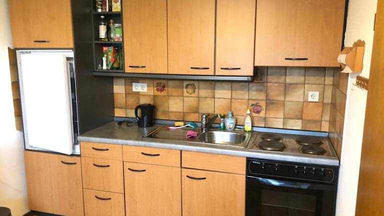 Die Ferienwohnung bietet ein Schlafzimmer, ein Wohnzimmer, eine gut ausgestattete Küche mit Kühlschrank und Ofen sowie ein Badezimmer mit Dusche. Eine Terrasse und Gartenblick sind ebenfalls vorhanden.