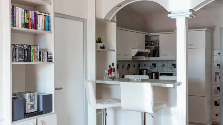 Die Ferienwohnung besteht aus einem Schlafzimmer, einem Wohnzimmer mit Sitz- und Essbereich sowie einer voll ausgestatteten Küche mit Kühlschrank, Ofen und Mikrowelle. Zur weiteren Ausstattung gehören ein Badezimmer mit Dusche und Whirlpool, Handtücher sowie Bettwäsche.