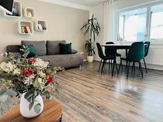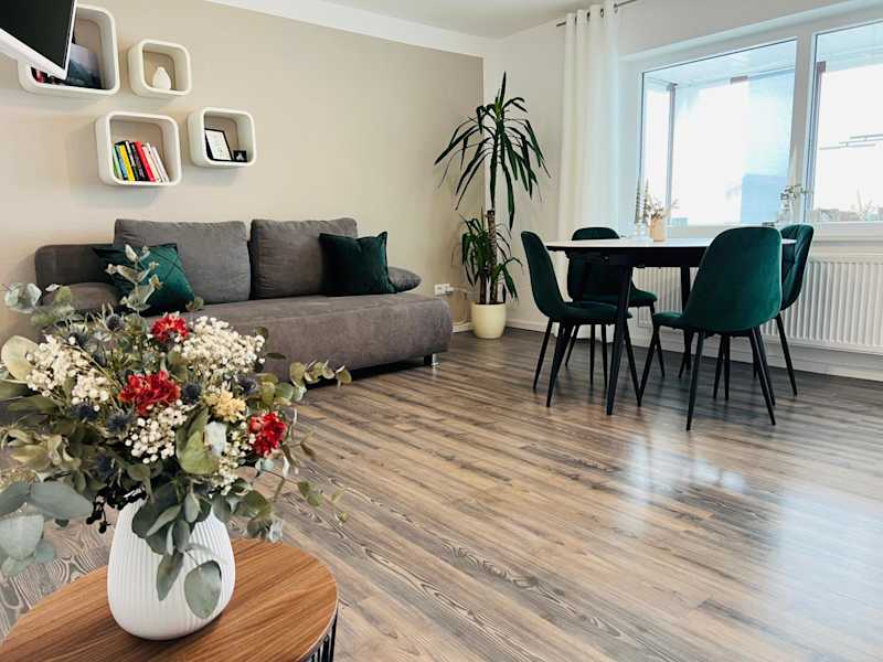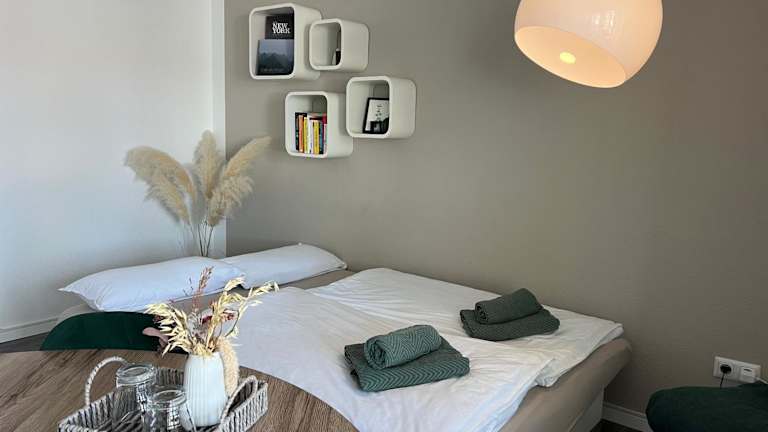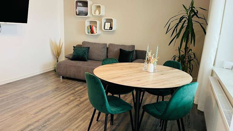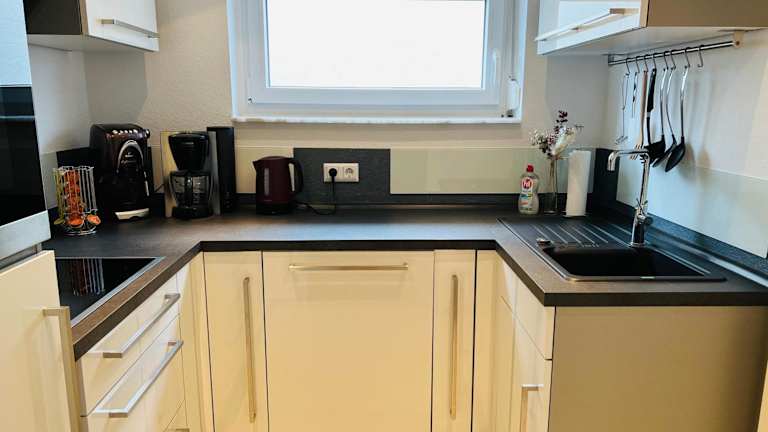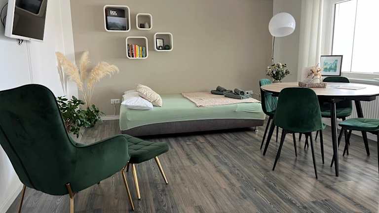Die Ferienwohnung verfügt über ein Schlafzimmer, eine Küche, die mit einem Kühlschrank und einem Geschirrspüler ausgestattet ist, einen Flachbild-TV sowie einen Sitzbereich. Es gibt ein Badezimmer mit Dusche. Handtücher und Bettwäsche werden bereitgestellt.