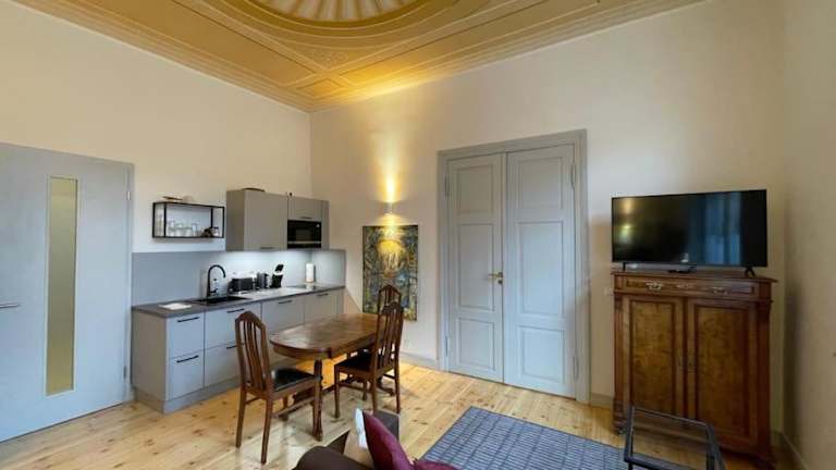 Die Ferienwohnung befindet sich in Schwerin, in unmittelbarer Nähe zu bedeutenden Sehenswürdigkeiten wie dem Staatlichen Museum Schwerin (200 m), dem Mecklenburgischen Staatstheater Schwerin (300 m) und dem Schweriner Schloss (500 m). Der Hauptbahnhof Schwerin liegt 1,2 km entfernt und die Sport- und Kongresshalle Schwerin ist 1,9 km von der Unterkunft entfernt. Der nächstgelegene Flughafen ist der Flughafen Lübeck, welcher 72 km entfernt ist.