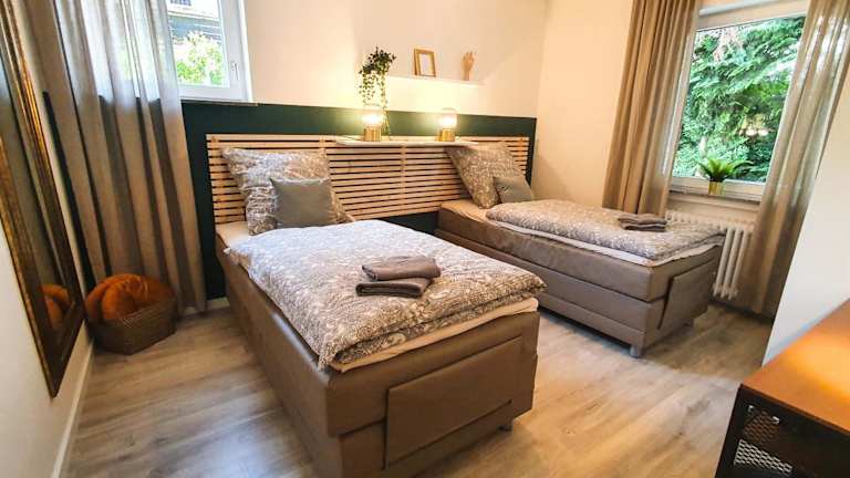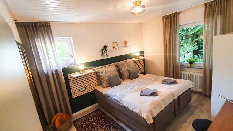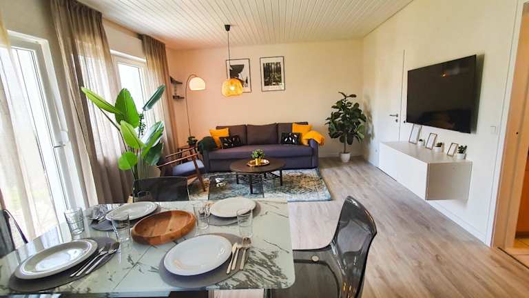 Die Ferienwohnung bietet ein Schlafzimmer, ein Wohnzimmer, einen Flachbild-TV sowie eine gut ausgestattete Küche mit Kühlschrank und Geschirrspüler. Zudem steht ein Badezimmer mit Badewanne zur Verfügung. Handtücher und Bettwäsche werden bereitgestellt. Die Unterkunft verfügt über eine Terrasse mit Gartenblick. Die Ferienwohnung bietet Nichtraucherzimmer und eine Sonnenterrasse, die zur Entspannung einlädt.