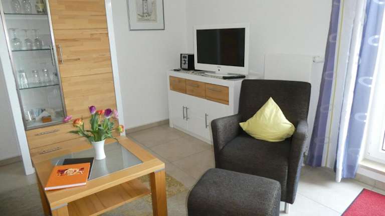 Die Ferienwohnung umfasst 1 Schlafzimmer, ein Wohnzimmer mit TV, eine gut ausgestattete Küche mit Kühlschrank und Geschirrspüler sowie ein Badezimmer mit Dusche. Von einem Balkon aus bietet sich ein Meerblick. Das Zimmer ist für Nichtraucher ausgelegt. Haustiere sind nicht gestattet.
