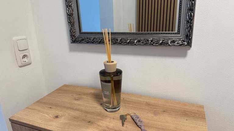 Essenslieferung in die Unterkunft ist möglich. Die Küche der Ferienwohnung verfügt über alle notwendigen Geräte, darunter einen Kühlschrank und einen Geschirrspüler, um Selbstverpflegung zu ermöglichen.