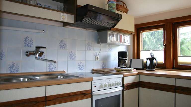 Die Ferienwohnung verfügt über eine voll ausgestattete Küche, die mit einem Kühlschrank und einer Kaffeemaschine ausgestattet ist. Es sind keine weiteren Verpflegungsmöglichkeiten aufgeführt.