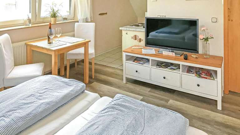 Die Ferienwohnung ist mit einem Wohnzimmer ausgestattet und verfügt über eine voll ausgestattete Küche. Außerdem stehen ein Kühlschrank und eine Herdplatte zur Verfügung.