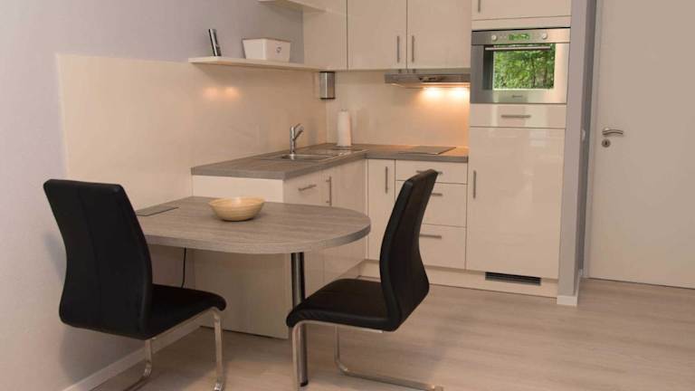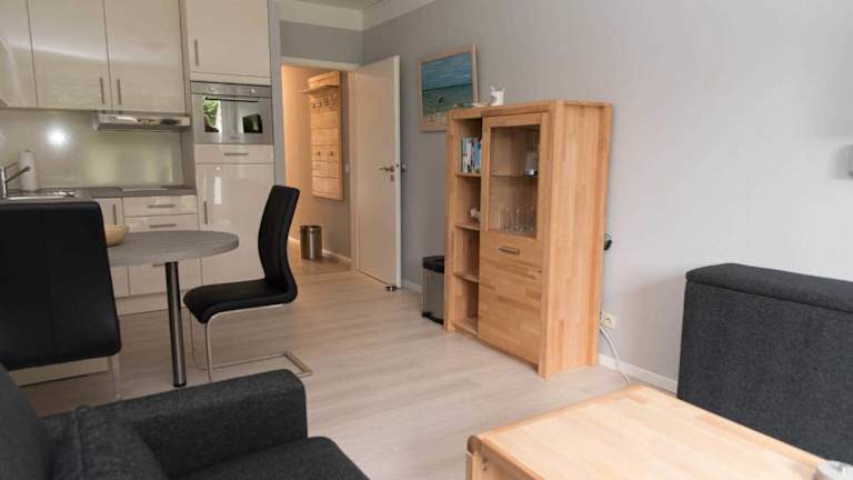 Die Küchenzeile der Ferienwohnung ist mit einem Kühlschrank, Geschirrspüler, Ofen, Kaffeemaschine und Wasserkocher ausgestattet, was eine Selbstverpflegung ermöglicht.