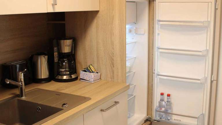 Die Küchenzeile in der Ferienwohnung ist mit einem Kühlschrank und einer Kaffeemaschine ausgestattet, was Gästen die Möglichkeit bietet, sich selbst zu verpflegen. Handtücher und Bettwäsche werden bereitgestellt.