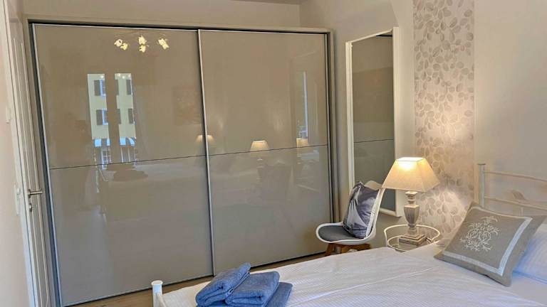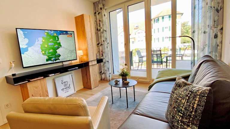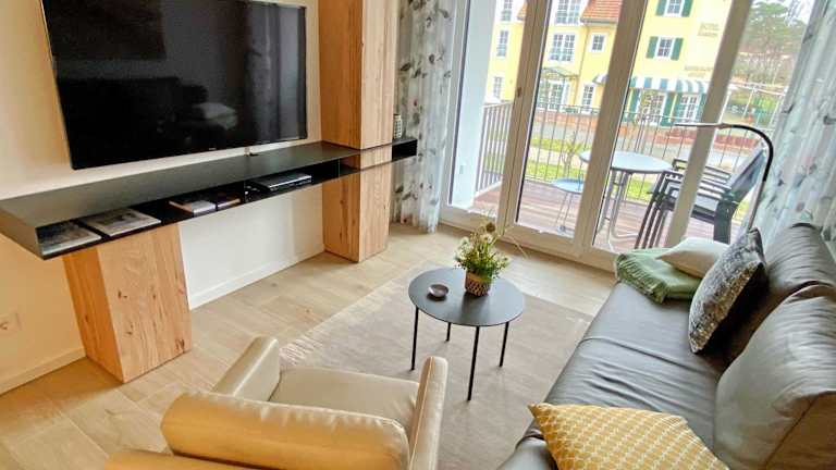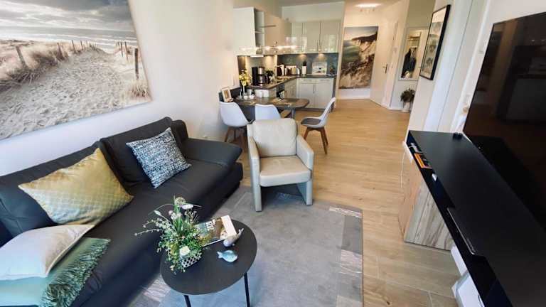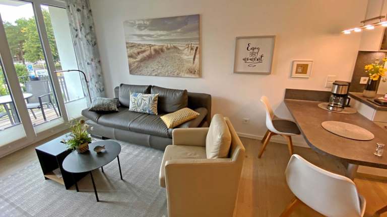 Die Ferienwohnung verfügt über ein Schlafzimmer, ein Wohnzimmer, einen Flachbild-TV sowie eine gut ausgestattete Küchenzeile mit Kühlschrank und Geschirrspüler. Das Badezimmer ist mit einer Dusche ausgestattet. Zur Ausstattung gehören auch ein Balkon mit Meerblick, Gartenmöbel sowie die Möglichkeit, Handtücher und Bettwäsche gegen Aufpreis zu erhalten.