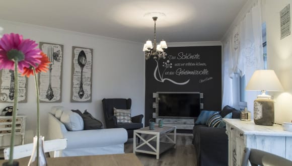 Unsere Ferienwohnung wurde mit viel Liebe zum Detail ganz im Stil des Vintage / Shabby Looks eingerichtet, mit allen Annehmlichkeiten, die man braucht, um einen erholsamen Urlaub zu verbringen. „Altes“ Interieur gemischt mit modernster Wohnqualität bildet das perfekte Ambiente für einen erholsamen Urlaub. Egal, ob Sie einen gemütlichen Abend an dem großen Esstisch verbringen oder aber im angrenzenden Wohnzimmer relaxen, die Wohnung bietet viel Raum, um es sich gut gehen zu lassen. Mit 3 großen Schlafzimmern lässt sich hier ein Urlaub mit Freunden oder aber auch der großen Familie verbringen. Die gemütliche Terrasse hinter dem Haus lädt dazu ein die letzten Strahlen der Abendsonne zu genießen - egal ob bei einem leckeren Kaffee oder einem guten Glas Wein - hier genießt man die Ruhe und kann in gemütlicher Runde auch ein leckeres Essen am Grill zubereiten. Zum Entspannen lädt das gemütliche Bad ein, indem Sie ein Schaumbad zum Relaxen genießen können.