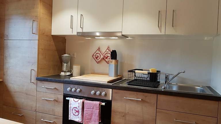 Die Ferienwohnung umfasst zwei getrennte Schlafzimmer, ein Wohnzimmer sowie eine voll ausgestattete Küche mit Kühlschrank und Kaffeemaschine. Zudem gibt es ein Badezimmer mit Dusche und Haartrockner. Handtücher und Bettwäsche werden bereitgestellt.