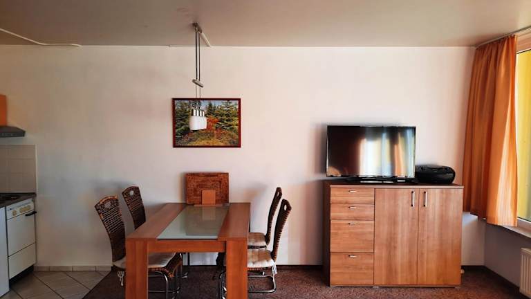 Die Ferienwohnung verfügt über ein Schlafzimmer, ein Wohnzimmer, einen Flachbild-TV und eine gut ausgestattete Küche mit Kühlschrank und Ofen. Es gibt ein Badezimmer mit Badewanne. Ein Balkon mit Bergblick sorgt für zusätzlichen Komfort. Handtücher und Bettwäsche können gegen Aufpreis bereitgestellt werden.