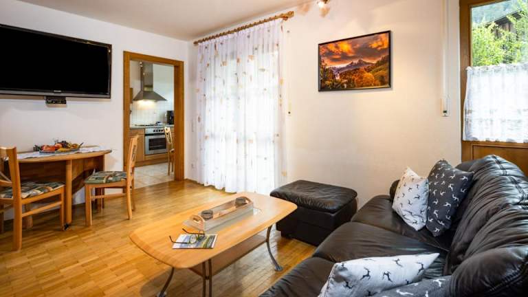 Die Ferienwohnung besteht aus einem Schlafzimmer, einem Wohnzimmer mit Flachbild-TV, einer gut ausgestatteten Küche (inklusive Kühlschrank und Geschirrspüler) sowie einem Badezimmer mit Badewanne. Handtücher und Bettwäsche werden bereitgestellt. Die Unterkunft verfügt außerdem über eine Terrasse mit Bergblick.