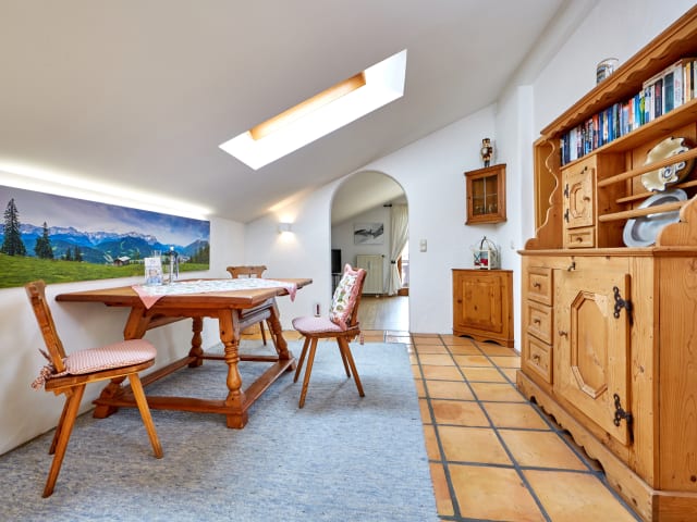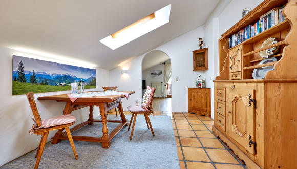 Garmisch-Partenkirchen präsentiert sich mit Tradition und Moderne, mit pulsierender Lebendigkeit und einsamer Stille, mit bayerischem Charme, aber auch städtischem Flair. Garmisch-Partenkirchen ist zu jeder Jahreszeit eine Reise wert. Mit viel Liebe eingerichtete 2 Zimmer-Dachgeschoss-Wohnung 70 m² (volle Stehhöhe), Wohn- und Schlafzimmer, extra Küche, Bad/WC, Gästetoilette, 2 Balkone, Kabel-TV, kostenloses W-LAN, Tiefgarage inklusive (Höhe 1,95m) in kleiner Wohnanlage "Haus Birkenhof" am Ortsrand von Garmisch. Im Umkreis von 5-Gehminuten finden Sie die Bushaltestelle (Benutzung kostenlos mit der Kurkarte), zwei Bäckereien, ein Café, ein Obst- und Gemüsegeschäft, eine bayrische Wirtschaft, einen kleinen Speckladen und auf den gegenüberliegenden Wiesen liegt im Winter das weitläufig gespurte Loipennetz von Garmisch-Partenkirchen. Einkaufszentren sind mit dem PKW oder dem Ortsbus bequem zu erreichen.