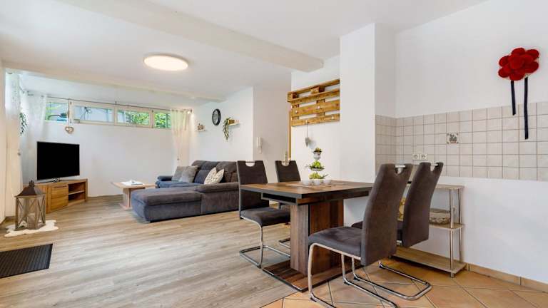 Die Ferienwohnung Zimmermann bietet eine komfortable Unterkunft mit einem Wohnzimmer und einem TV, ideal zum Entspannen nach einem ereignisreichen Tag. Die kleine Terrasse lädt zum Verweilen im Freien ein und die voll ausgestattete Küchenzeile mit Essbereich ermöglicht es Ihnen, Ihre eigenen Mahlzeiten zuzubereiten. Das Badezimmer ist mit einer Dusche ausgestattet. Kostenloses WLAN steht Ihnen in der gesamten Ferienwohnung zur Verfügung.