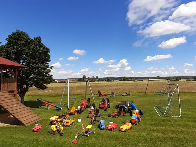 Streicheltiere (Katzen und Hasen) Badminton-, Volleyball- und Fußballfeld große und kleine Kettkars (von 4-99 Jahren) Spielturm mit Schaukel, Rutsche, Klettermöglichkeiten und Hängematte großes Trampolin sowie Sandkasten und Wippe Brunnen mit Wasserpumpe Entspannen auf der Liegewiese Spielscheune mit Kicker und Tischtennis Spielzimmer im Haus