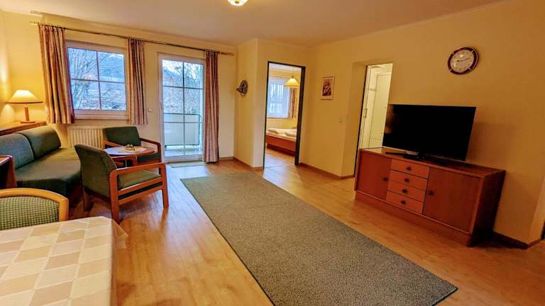 Die Ferienwohnung bietet Blick auf den See und umfasst ein Wohnzimmer, zwei Schlafzimmer, einen Balkon, einen Satelliten-Flachbild-TV sowie eine gut ausgestattete Küche und ein Badezimmer mit Dusche.