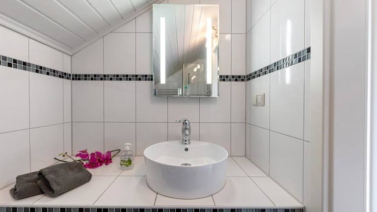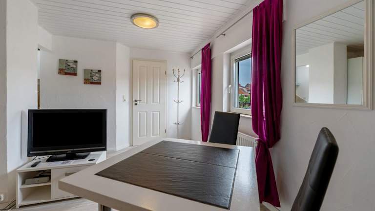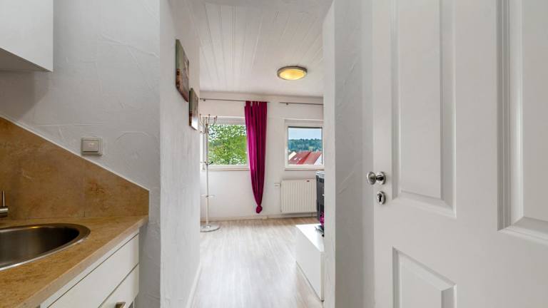 Es sind Kochmöglichkeiten in der voll ausgestatteten Küche vorhanden, die unter anderem mit einem Kühlschrank, einer Mikrowelle, einer Herdplatte und einem Wasserkocher ausgestattet ist.